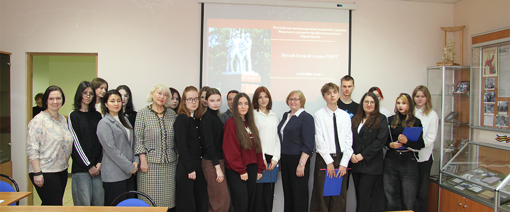 Профессиональной задачей данного посещения для студентов было формирование компетенций экскурсовода в рамках дисциплины «Экскурсионная деятельность» на примере работы студентов–экскурсоводов, активистов Музея боевой славы РМАТ.