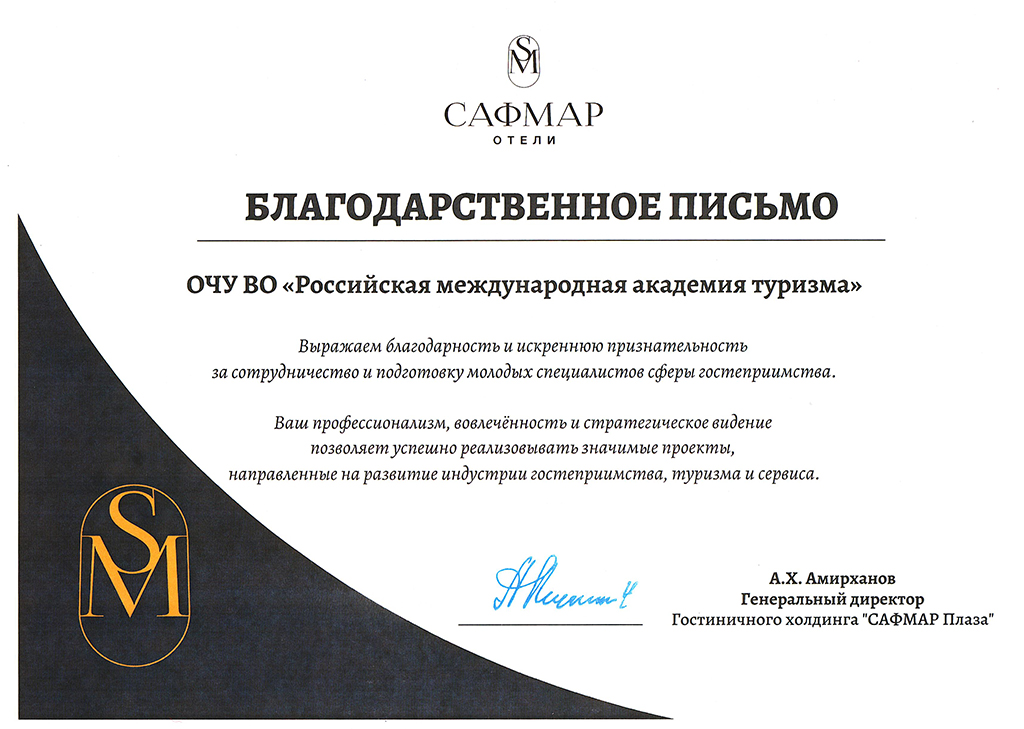 Студенты Академии регулярно проходят практику в отелях данной сети. По результатам 2025 года генеральный директор гостиничного холдинга «Сафмар Плаза» Амирханов А.Х. выразил благодарность и искреннюю признательность РМАТ за сотрудничество и подготовку молодых специалистов сферы гостеприимства. Руководитель холдинга отметил профессионализм, вовлеченность и стратегическое видение профессорско-преподавательского состава Академии, который позволяет успешно реализовать значимые проекты, направленные на развитие индустрии гостеприимства, туризма и сервиса.