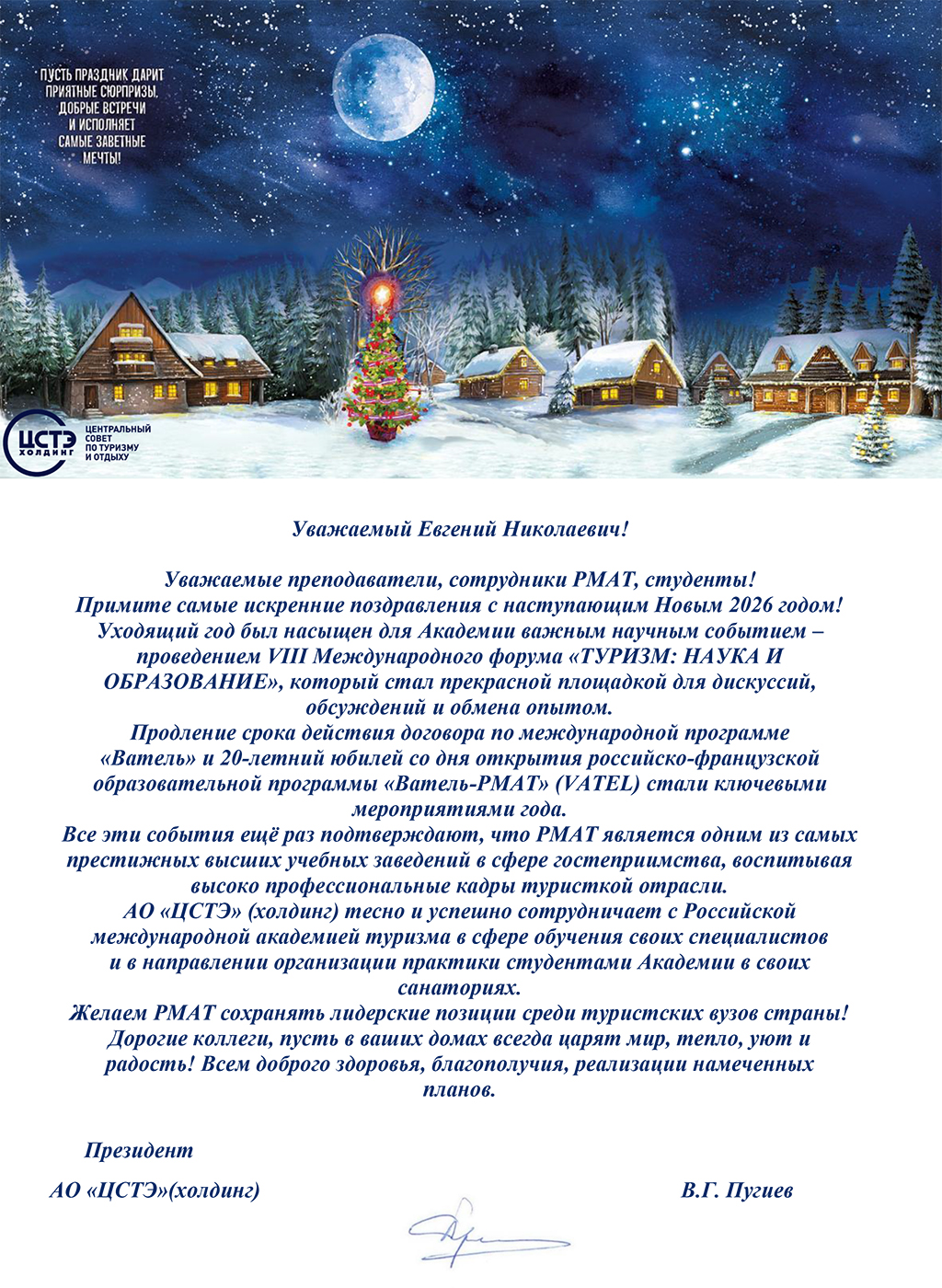 УЧРЕДИТЕЛЬ РМАТ, ПРЕЗИДЕНТ АО "ЦСТЭ" (ХОЛДИНГ) В.Г. ПУГИЕВ ПОЗДРАВЛЯЕТ С НОВЫМ ГОДОМ!