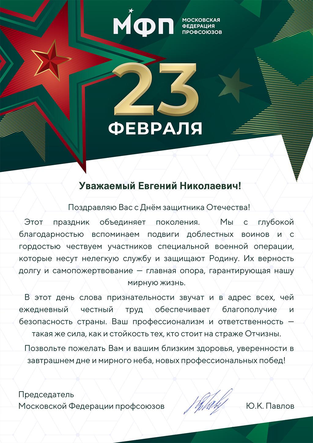 ПРЕДСЕДАТЕЛЬ МОСКОВСКОЙ ФЕДЕРАЦИИ ПРОФСОЮЗОВ Ю.К. ПАВЛОВ ПОЗДРАВЛЯЕТ С ДНЕМ ЗАЩИТНИКА ОТЕЧЕСТВА!