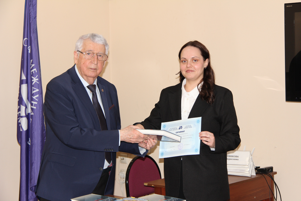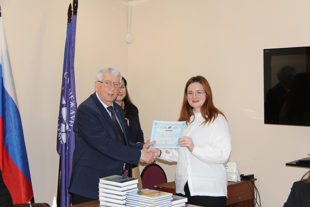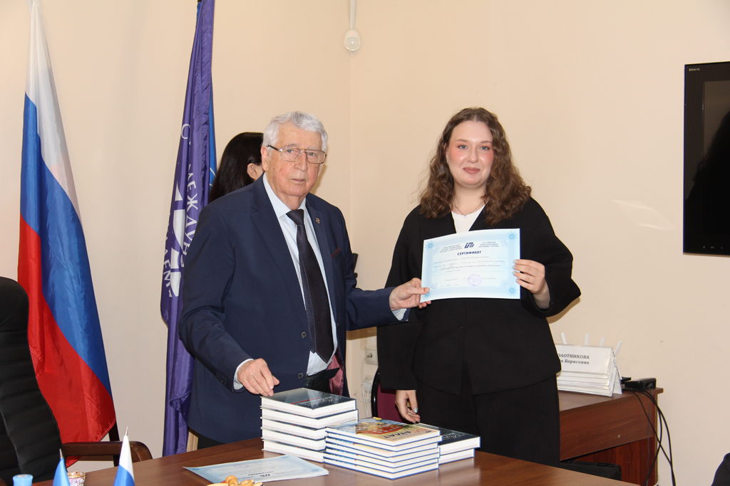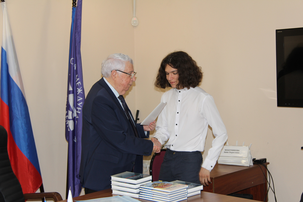 По завершении встречи Евгений Николаевич вручил каждому участнику Зимней школы в Индии сертификат и книги «Верность истокам» и «55 лет РМАТ: Новые горизонты» с персональной дарственной надписью.
