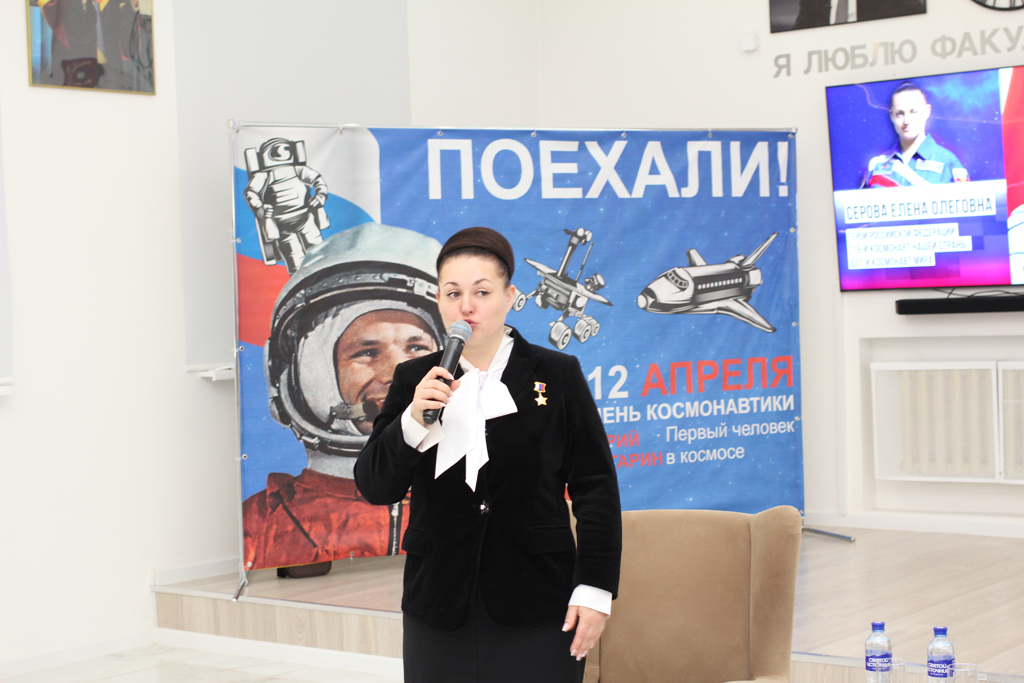 Знакомство с почётной гостьей началось с показа фильма о ней. Елена Серова совершила свой полет 26 сентября 2014 года на корабле «Союз ТМА-14М» к Международной космической станции (МКС). Она провела на орбите 167 дней, продолжив традицию участия женщин в освоении космоса и демонстрируя высокие профессиональные качества и стойкость в сложных условиях.