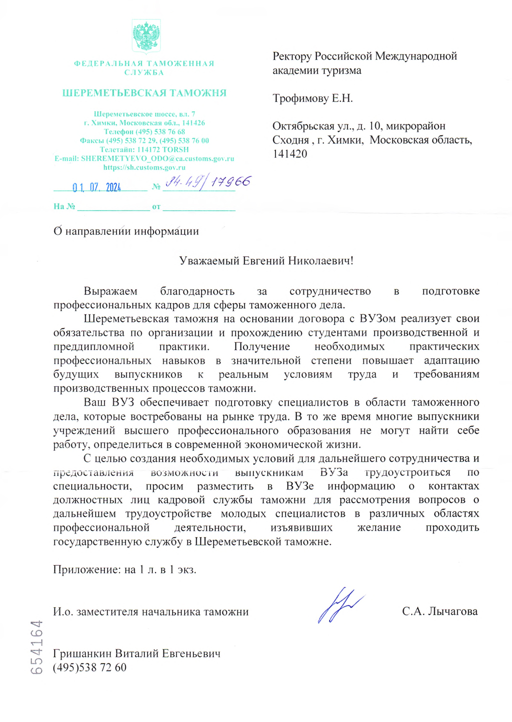 Сотрудничество Российской международной академии туризма с Шереметьевской таможней носит стратегический характер. По инициативе ректора РМАТ, доктора политических наук Трофимова Е.Н. в Академии успешно реализуется единственная специальность высшего образования (специалитет) 38.05.02 «Таможенное дело», которая была аккредитована в 2023 учебном году.