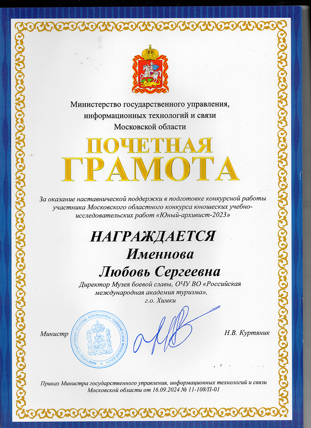 9 октября 2024 года Министерство государственного управления, информационных технологий и связи Московской области провело торжественное мероприятие по награждению лауреатов Московского областного конкурса учебно-исследовательских работ «Юный архивист-2023». На конкурс поступило 37 работ от 46 участников из 14 городских округов: Волоколамск, Долгопрудный, Домодедово, Егорьевск, Лотошино, Луховицы, Наро-Фоминск, Одинцово, Орехово-Зуево, Раменский, Рузский, Химки, Шатура, Щелково.