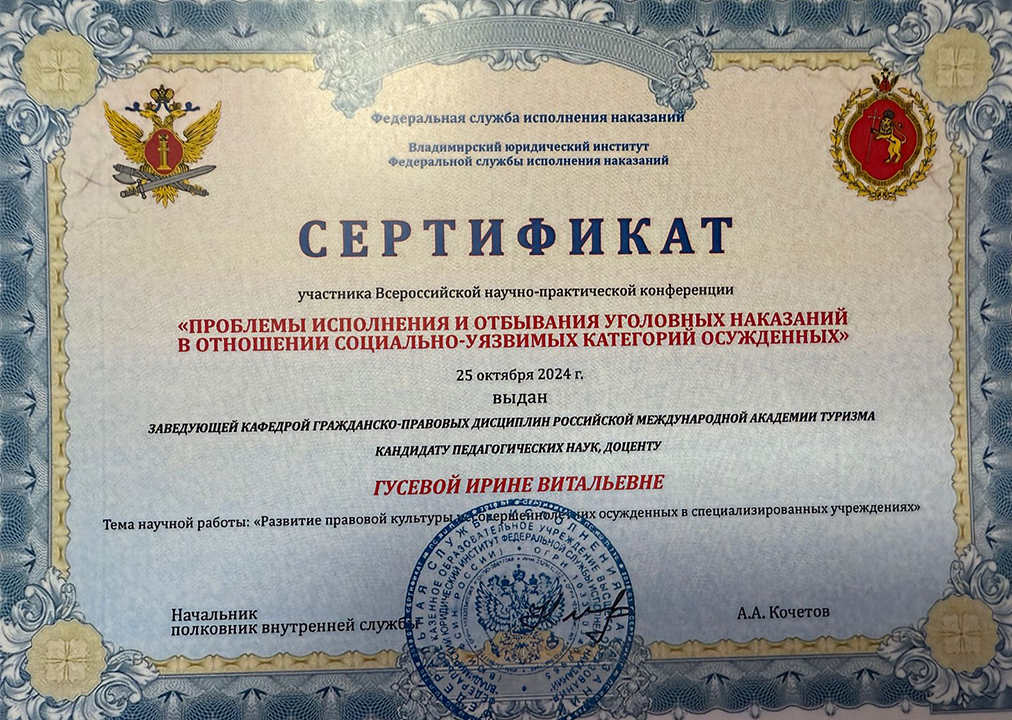 25 октября 2024 года по поручению ректора РМАТ доктора политических наук Трофимова Евгения Николаевича заведующая кафедрой гражданско-правовых дисциплин к.п.н., доцент Гусева Ирина Витальевна и студентка 3 курса специальности «Таможенное дело» Прокудина Диана приняли участие во Всероссийской научно-практической конференции «Проблемы исполнения и отбывания уголовных наказаний в отношении социально-уязвимых категорий осужденных», которая проходила на базе ВЮИ ФСИН г. Владимира.