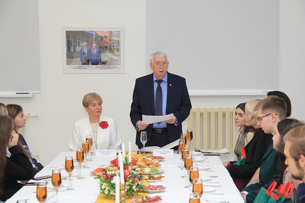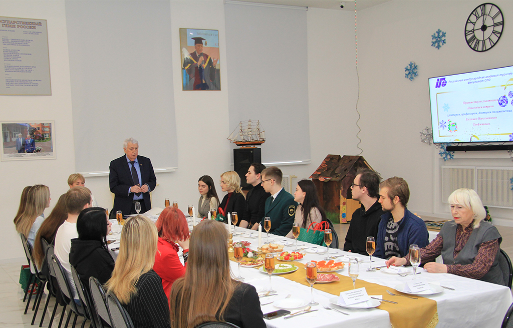 Это одна из важных встреч в ряду новогодних праздников. Евгений Николаевич придаёт особое значение воспитанию патриотизма у студентов Академии, поддержке тех, чьи отцы несут службу в зоне СВО. Откровенному разговору способствовала непринуждённая обстановка. Праздничное угощение, на котором также присутствовали проректор - декан факультета среднего профессионального образования Владимир Александрович Жидких, проректор – декан факультета менеджмента туризма Елена Аркадьевна Алилуйко, заместители декана факультета среднего профессионального образования Галина Григорьевна Лямина и Екатерина Александровна Горбунова, начальник отдела кадров Татьяна Владимировна Островская – было приготовлено в нарядно украшенном Актовом зале учебного корпуса № 2.