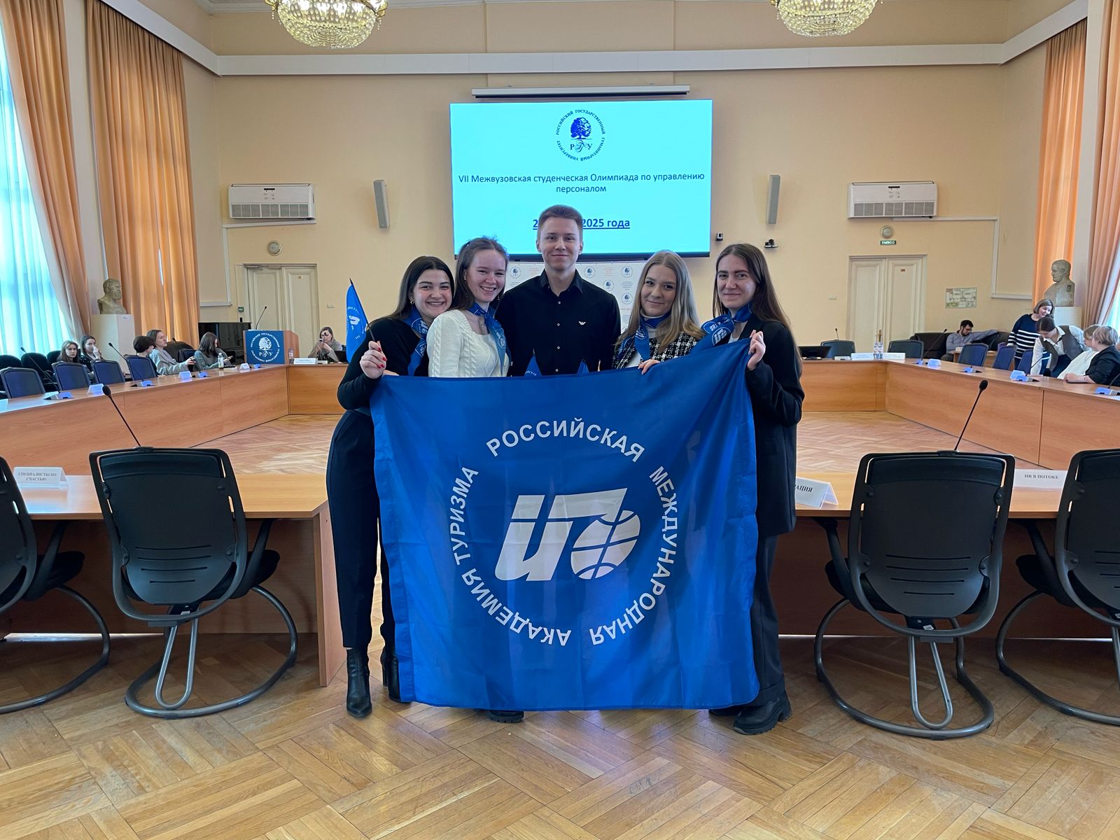 21 марта по приглашению организаторов Олимпиады (РГГУ) команда студентов РМАТ приняла участие в VII Межвузовской студенческой Олимпиаде по управлению персоналом. В олимпиаде участвовали студенты 4 курса очной формы обучения Российской международной академии туризма кафедры "Государственное и муниципальное управление и управление персоналом" под руководством доцента кафедры, кандидата педагогических наук Ивана Борисовича Попова. В команду вошли лучшие студенты кафедры, обучающиеся по направлениям «Управление персоналом» и «Государственное и муниципальное управление», которые уже в текущем учебном году получат дипломы о высшем образовании: Дарья Пьянзина, Анастасия Мациевская, Никита Брылин, Анастасия Самойлова и Эльмира Измайлова.