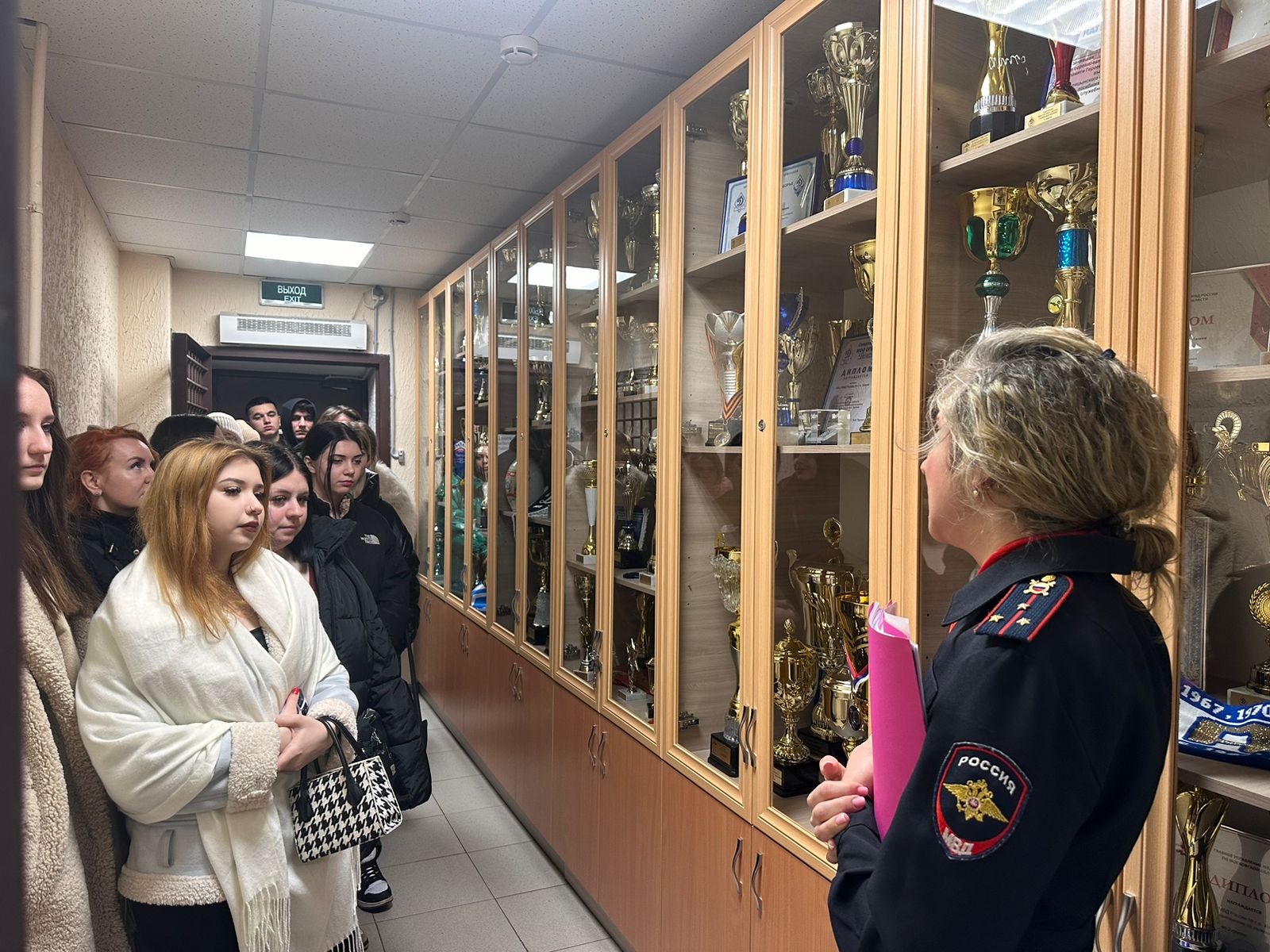 Встретила студентов представитель пресс-службы Управления Мария Алексеевна Ратникова, которая рассказала о направлениях деятельности органов внутренних дел, работе сотрудников полиции по осуществлению охраны общественного порядка и безопасности граждан, пресечению и раскрытию противоправных деяний.