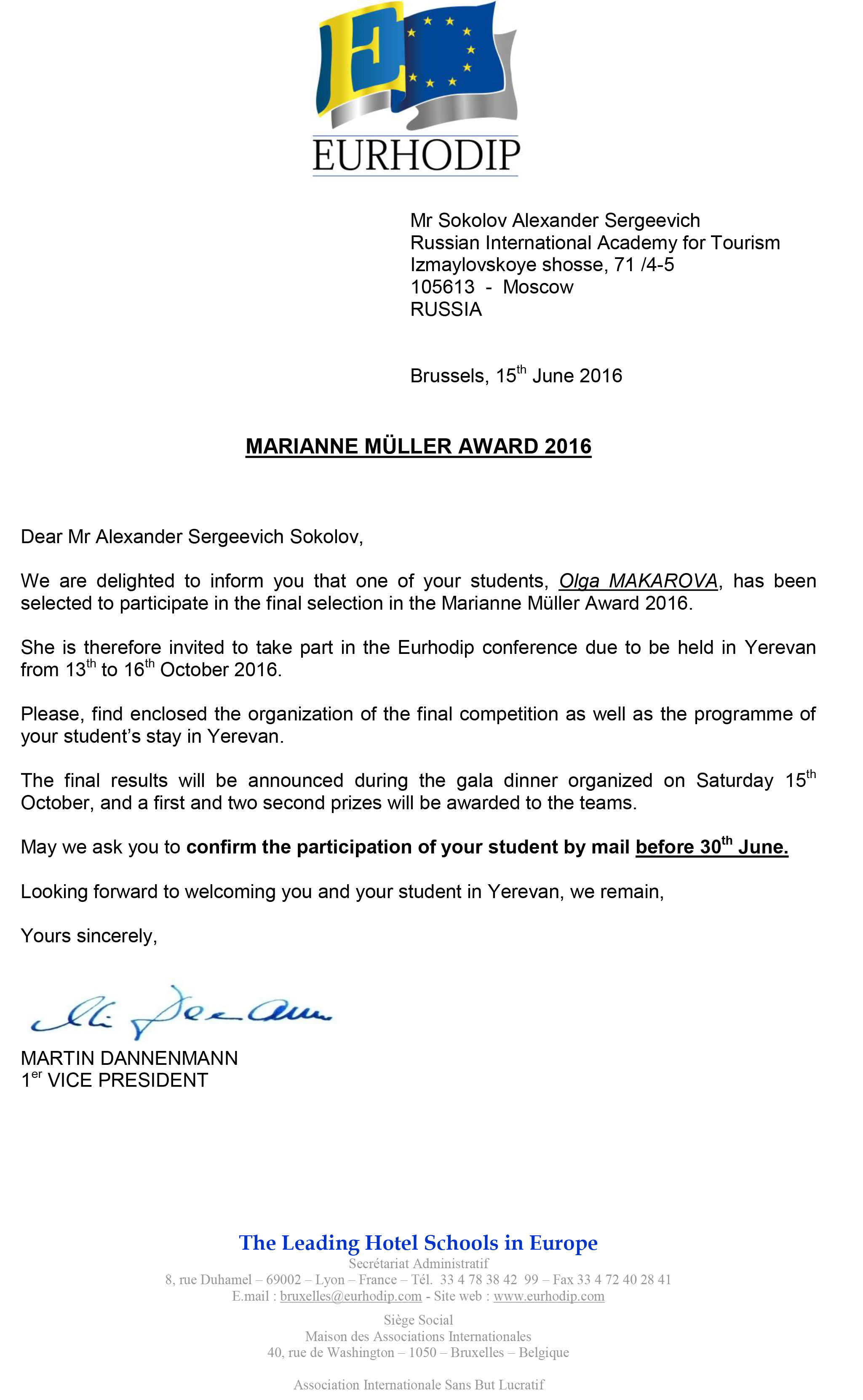 Студентка кафедры дизайна ландшафтного дизайна Московского филиала РМАТ Макарова Ольга по результатам отборочного тура выбрана для участия в ежегодном Инновационном студенческом конкурсе имени Марианны Мюллер. Конкурс пройдет в рамках 23 конференции Ассоциации ведущих европейских школ гостиничного менеджмента и туризма Европы (ЕВРОДИП) в период с 13-16 октября 2016 г. в Армении.