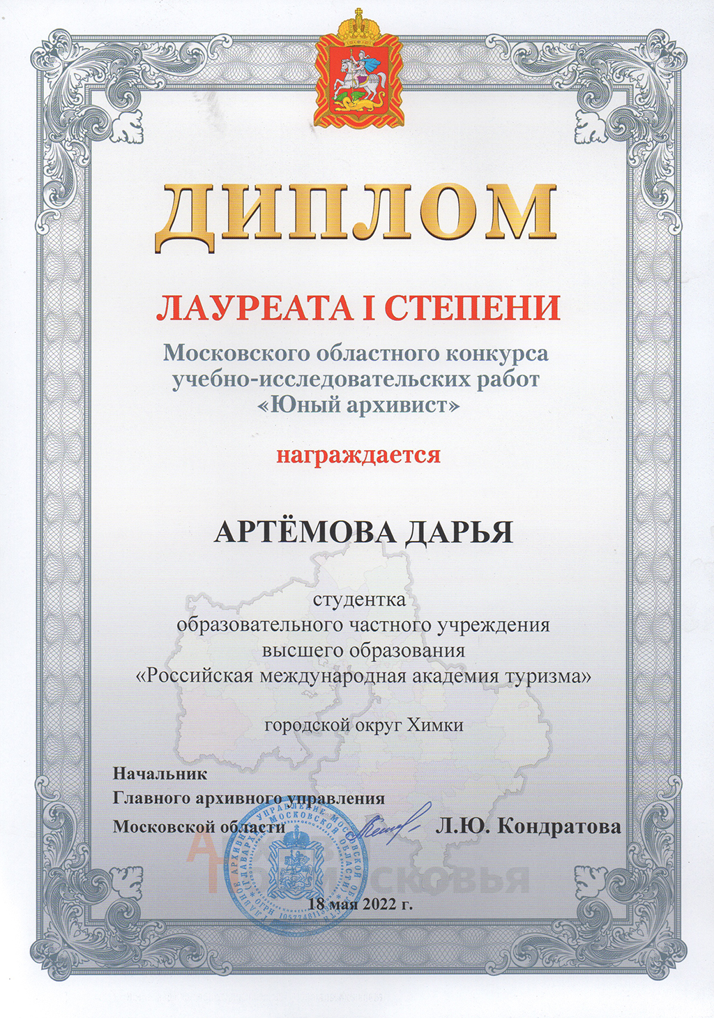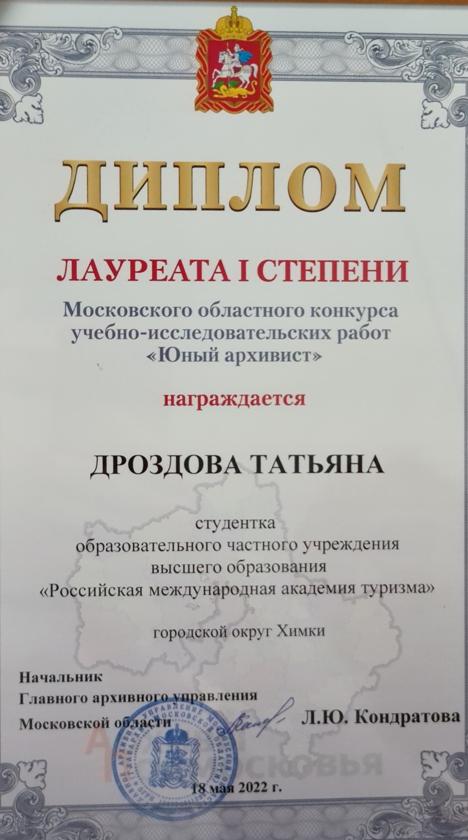В числе победителей – студенты Образовательного частного учреждения высшего образования «Российская международная академия туризма», активисты Музея боевой славы. Дипломов лауреата I степени удостоены две коллективные работы: «Комплексный анализ исторических источников о химкинском ополченце Н.Ф. Семенове» (Леонид Каблуков, Дмитрий Юданов, 2 курс факультета СПО РМАТ) и «Именные списки военнослужащих, направленных в народное ополчение Химкинским РВК» (Дарья Артемова, Светлана Василенко, Татьяна Дроздова, 3 курс факультета СПО РМАТ). Благодарственное письмо Главного архивного управления Московской области за оказание наставнической поддержки в подготовке конкурсных работ вручено Именновой Любови Сергеевне, директору Музея боевой славы РМАТ, доктору культурологии.